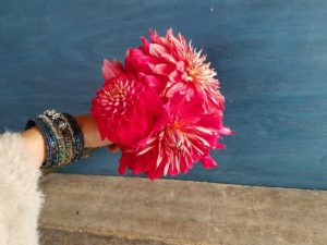 美しいダリアのお花が我が家にやって来たので、グリーンネックレスと一緒に、Majorcaでもお世話になっております陶芸家、中園晋作くんの花器にて早速飾ってみました。